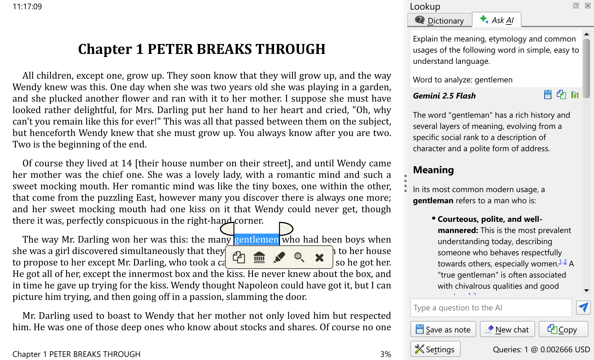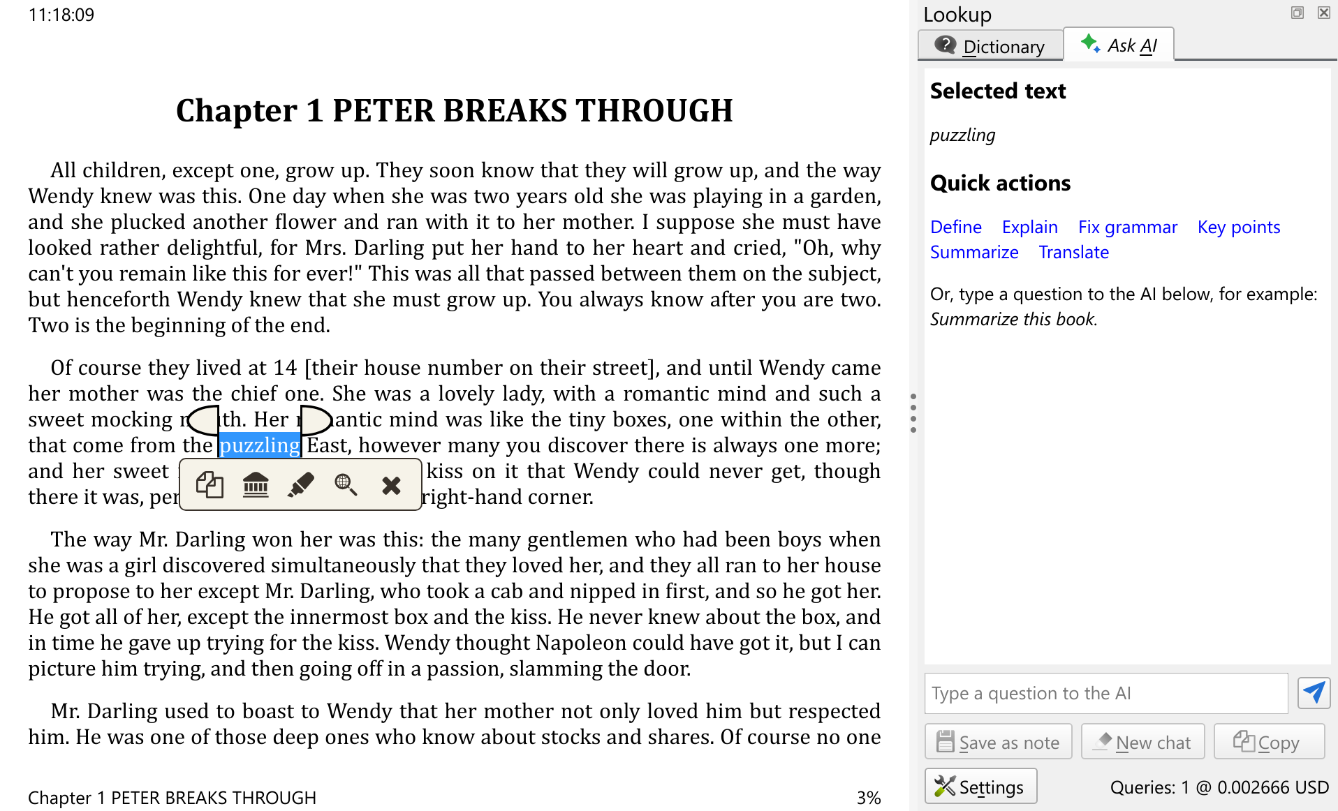 To use this feature in the E-book viewer, simply select some text, then click the lookup button on the pop-up toolbar and use the Ask AI tab to discuss your selected text with the AI.