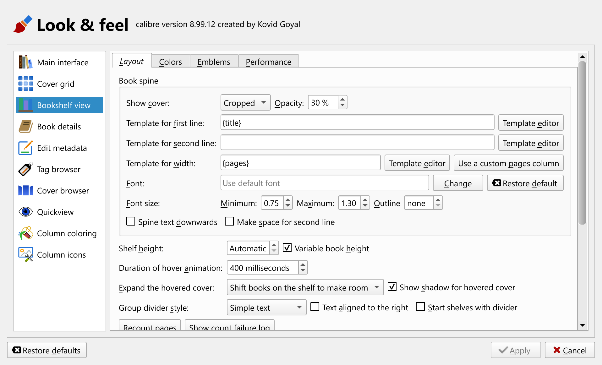 In fine calibre tradition, the new view is highly customisable so you can configure it to look just how you like. Everything from the font used for spines to how cover thumbnails are displayed on the spine is configurable. By default, the thickness of the books is calculated based on a new builtin Pages column, but if you prefer to use another column, you can do so as well. The new builtin column is automatically maintained once you activate the bookshelf view and uses a content based estimate of the number of pages in the book.