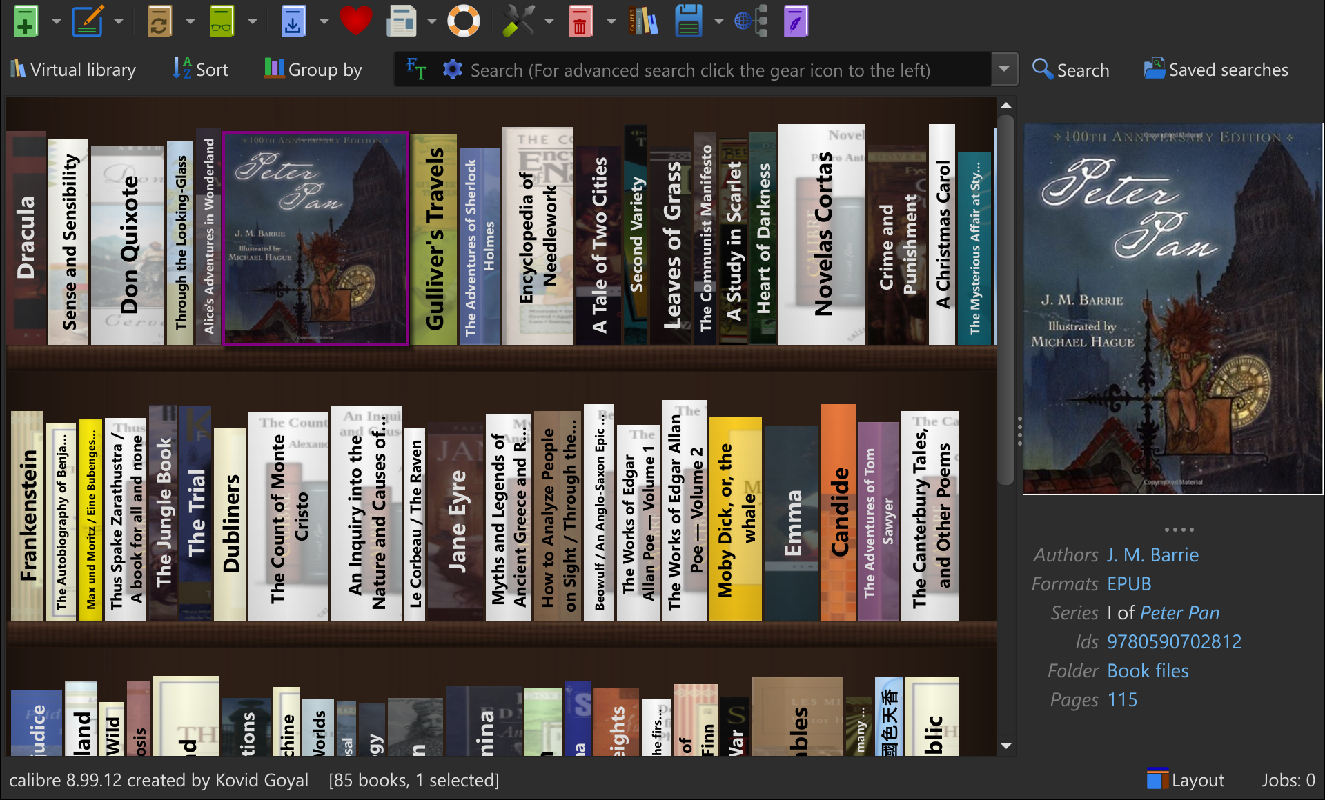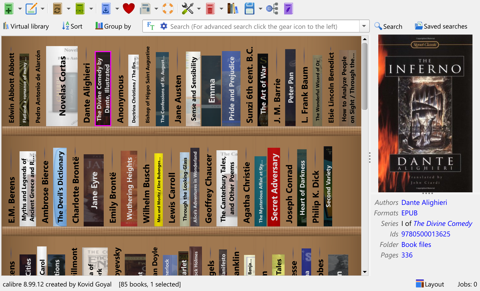 A new Bookshelf view shows your calibre library as rows of books on shelves. You can group the books by Authors/Series/etc. for convenient browsing. Hovering over the spine of a book shows the full book cover.